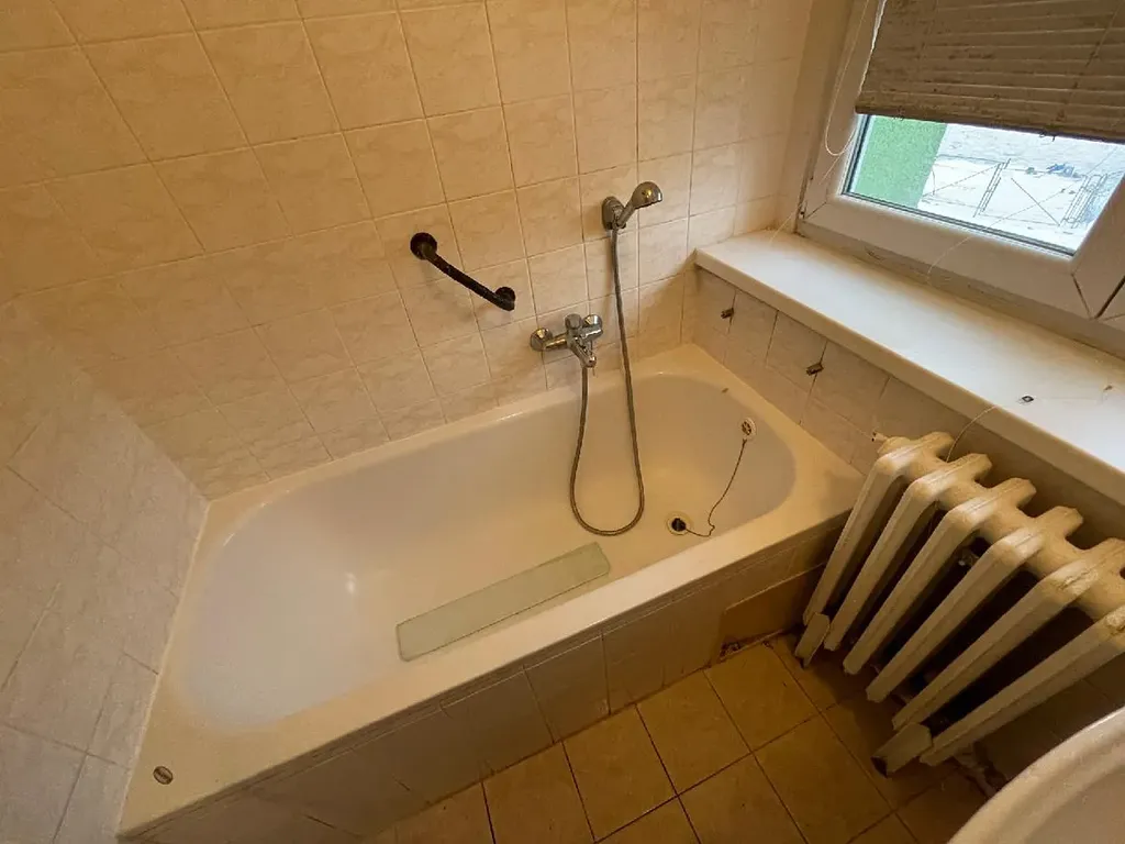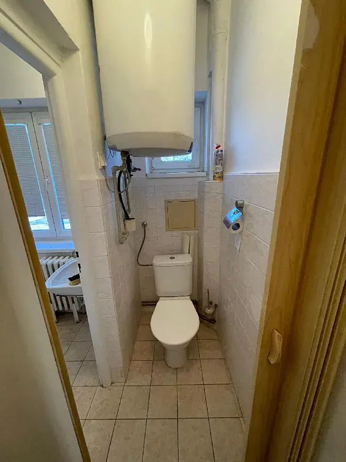 Koupelna je vybavena vanou, umyvadlo bude nainstalováno nové. V prostorách WC je elektrický bojler, který zajišťuje ohřev vody.