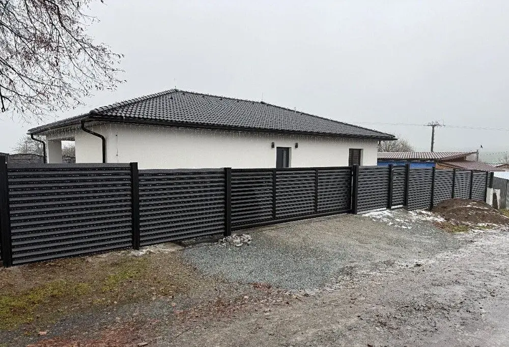 Dům je oplocen betonovým plotem, do ulice jsou hliníková vrata. Dům je aktuálně kolaudován