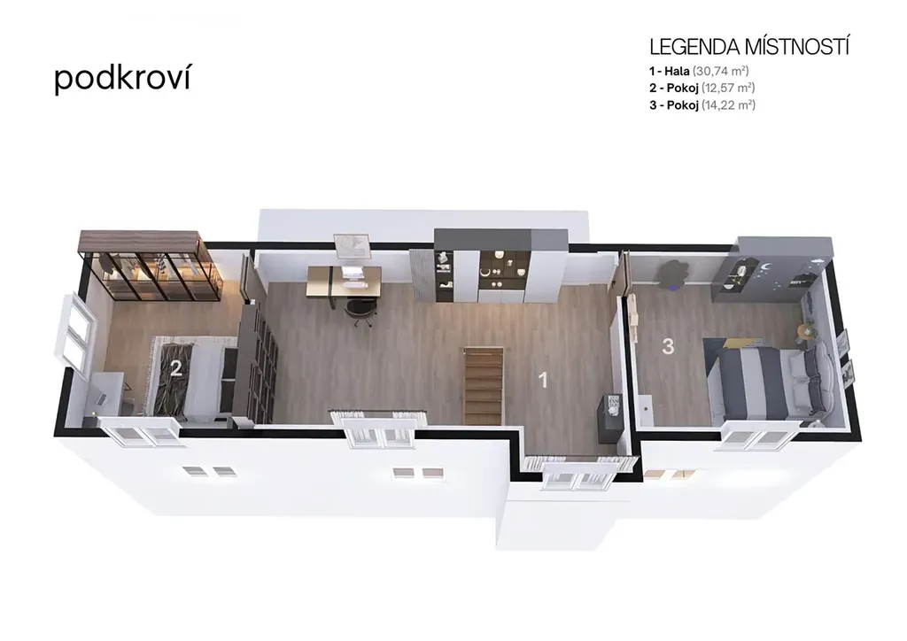 Stavba je rozdělena na dvě plnohodnotné a provozně oddělené bytové jednotky. V prvním nadzemním podlaží se nachází bytová jednotka o dispozici 2+1 s podlahovou plochou 68 m. Ve druhém a třetím nadzemním podlaží je umístěn prostorný mezonetový byt o dispozici 4+kk s výměrou 134 m. Celková užitná plocha činí 201,87 m, zastavěná plocha dosahuje 97,9 m a celková výměra pozemku je 154 m. Dispoziční řešení umožňuje plnohodnotné soužití více generací pod jednou střechou, případně kombinaci vlastního bydlení a pronájmu.