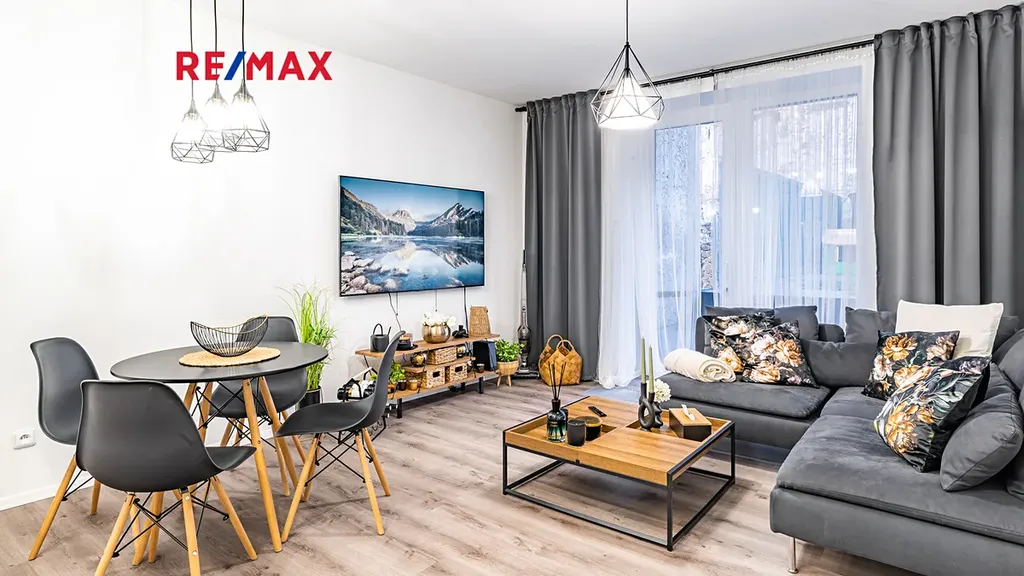 Byt je připraven k okamžitému nastěhování. Součástí vybavení bytu je 65" Smart TV SAMSUNG QE65Q80A, set pračky se sušičkou, tyčový vysavač, moderní úsporná svítidla, interiérové dekorace atd. Kuchyňská linka je v bílém provedení s černými úchytnými lištami, vybavená spotřebiči - pečící el. trouba, indukční varná deska, mikrovlnná trouba, lednice, myčka nádobí, digestoř.