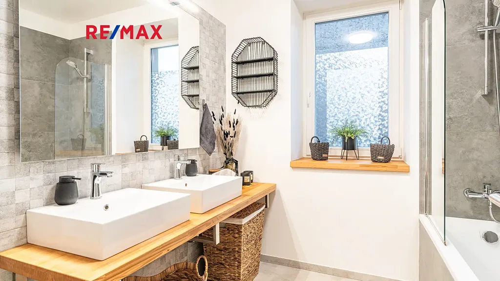 Byt je vybaven vlastním plynovým kotlem BUDERUS Logamax + zásobníkem TUV 120L Logalux, umístěnými v technické místnosti, obojí s možností komfortního automatického ovládání. V koupelně i na toaletě jsou použity velmi kvalitní obklady a dlažby - Quenos grey + Quenos white, stejně jako zařizovací předměty - vana obdélníková Vagnerplast LINOS 170×75 cm + VILMA skleněná vanová zástěna 600x1400mm, 2x umyvadlo SISTEMA 50×42cm, AVICE deska 150x50cm old wood. Koupelna i toaleta mají vedle radiátorů možnost el. podlahového vytápění. V obývacím prostoru je v podlaze umístěn elektrický radiátor pro ohřev vzduchu před francouzskými dveřmi na terasu.