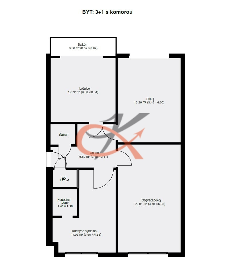 Sestává ze tří neprůchozích prostorných pokojů, kuchyně s jídelním koutem, koupelny, WC, chodby a komory, která může sloužit jako šatník či sklad sportovních a méně používaných věcí. Součástí kuchyňské linky jsou zabudované nové spotřebiče – myčka, indukční varná deska, digestoř a horkovzdušná el. trouba. Podlahy v pokojích jsou pokryté PVC v dekóru dřeva, ostatní místnosti kryje dlažba. Vytápění je řešeno dálkově s rozvodem tepla do radiátorů. K dispozici dále jídelní stůl s židlemi, velkorysá sedací souprava a manželská postel s nočními stolky. Ostatní zařízení a vybavení je na nájemnících dle potřeb a vkusu. Součástí bytu je sklepní box a společné prostory v přízemí domu a balkón (+ 3.5m²) s východní orientací.