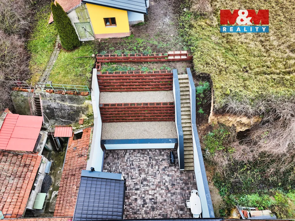 V přízemí se nachází technická místnost, koupelna s WC a obývací pokoj s kuchyní. V patře jsou tři pokoje a samostatné WC. Dům je napojen na všechny inženýrské sítě, vytápění zajišťuje plynový kotel. Pozemek o rozloze 693 m² nabízí terasu s markýzou, rekonstruovaný zahradní domek a nádrž na dešťovou vodu. Je zde také možnost pronájmu navazující zahrady, která zajišťuje zadní přístup.