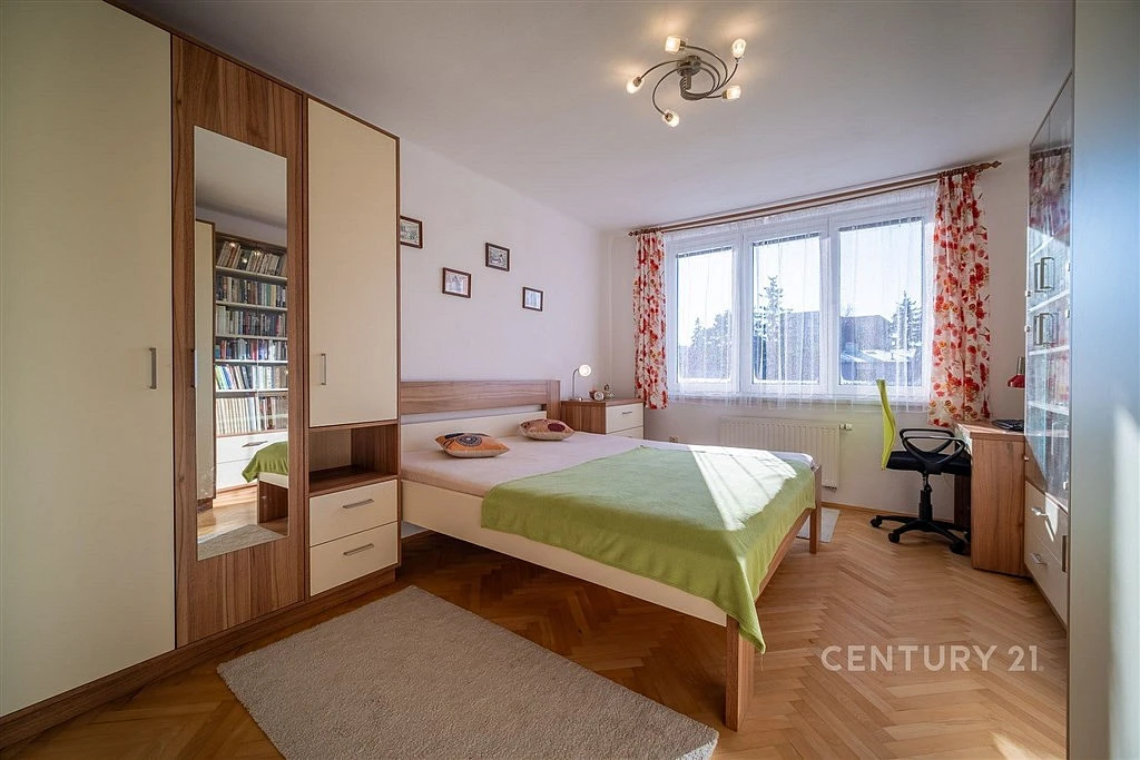 Byt se nachází ve druhém patře třípatrového zděného bytového domu. Byt prošel celkovou rekonstrukcí, nevyžaduje žádné investice a jeho dispozice je řešena takto: středem bytu prochází prostorná předsíň (6,10 m²), která je využita na maximum. Její součástí je nábytková sestava se spoustou úložného prostoru. Předsíň zajišťuje vstup do ložnice (16,57 m²) a pokoje (10,55 m²). Prostorná ložnice nabízí místo i pro pracovní stůl a knihovnu. Dále z předsíně vstupujeme do kuchyně (12,72 m²), která je propojena s obývacím pokojem (14,97 m²). Kuchyně je vybavena moderní kuchyňskou linkou s vestavěnými spotřebiči a z kuchyně je přímý vstup na balkon (2 m²). Při rekonstrukci se myslelo i na možné oddělení kuchyně od obývacího pokoje a průchod byl osazen dvoukřídlými posuvnými dveřmi. Koupelna (2,97 m²) je vybavena vanou, umyvadlem, přípojkou pro pračku a toaletou. Dveře do koupelny se nacházejí ihned při vstupu z předsíně do kuchyně.