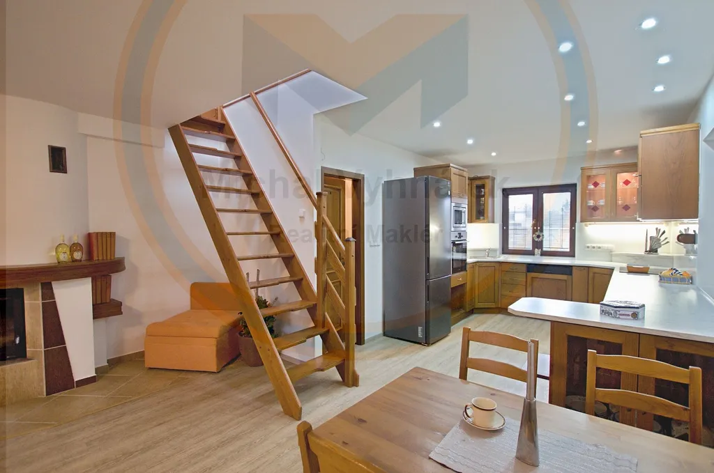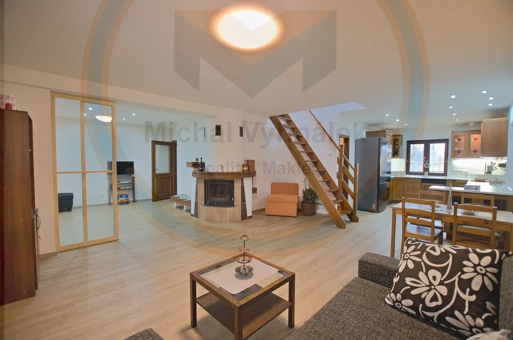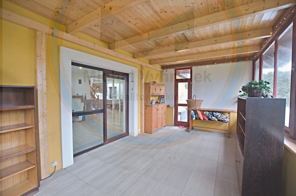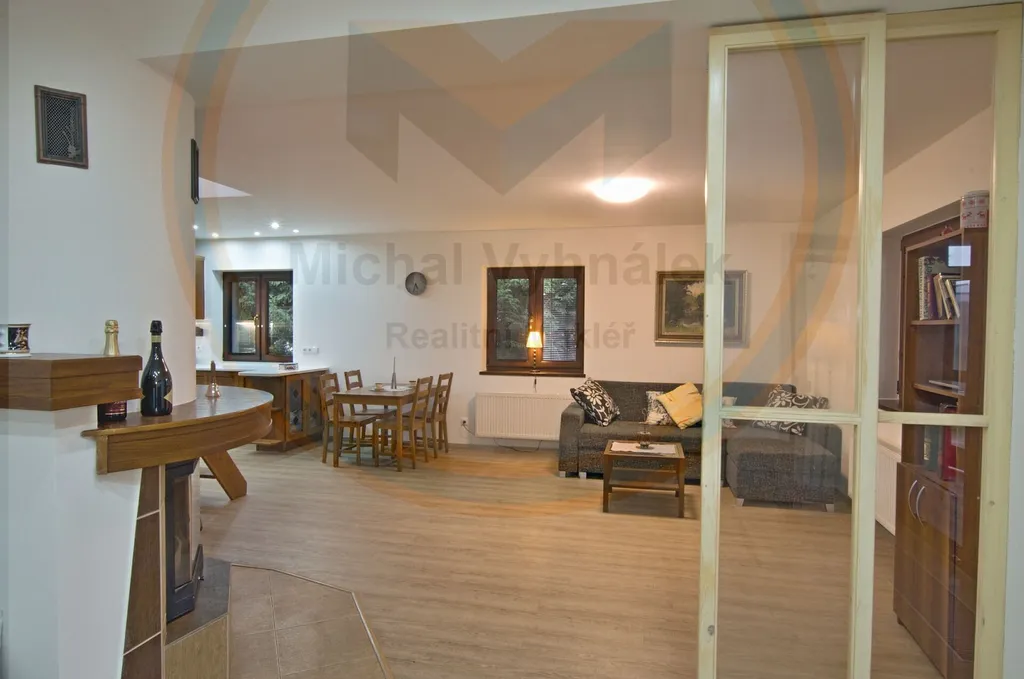 Dominantou domu je prostorný obytný prostor s kuchyňským koutem o výměře 50,45 m², propojený s terasou. Součástí kuchyně je samostatná místnost využívaná jako spíž, v této části domu je instalováno podlahové vytápění.