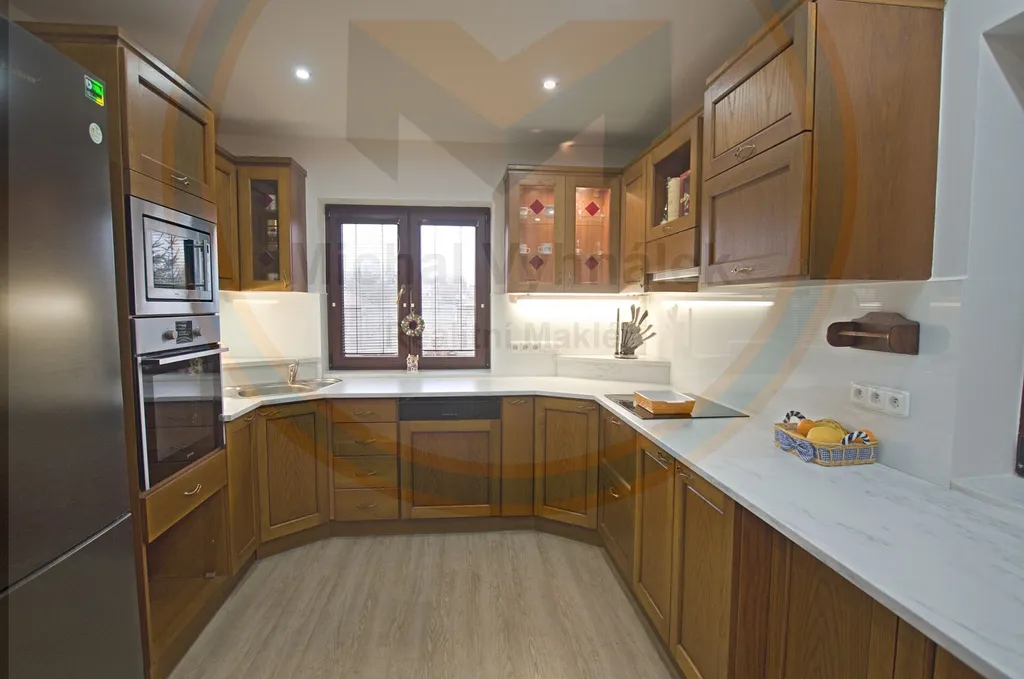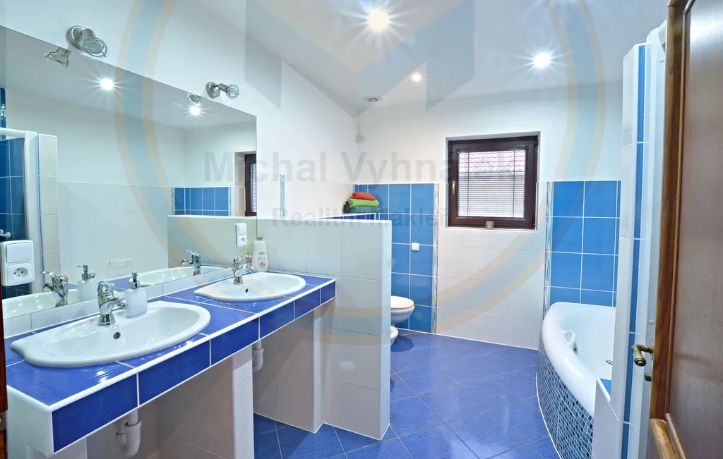 Další výraznou předností domu je koupelna o výměře 9,05 m², která nabízí vanou, sprchový kout, bidet, WC a dvojité umyvadlo, vše sladěné v jednotném obkladu.