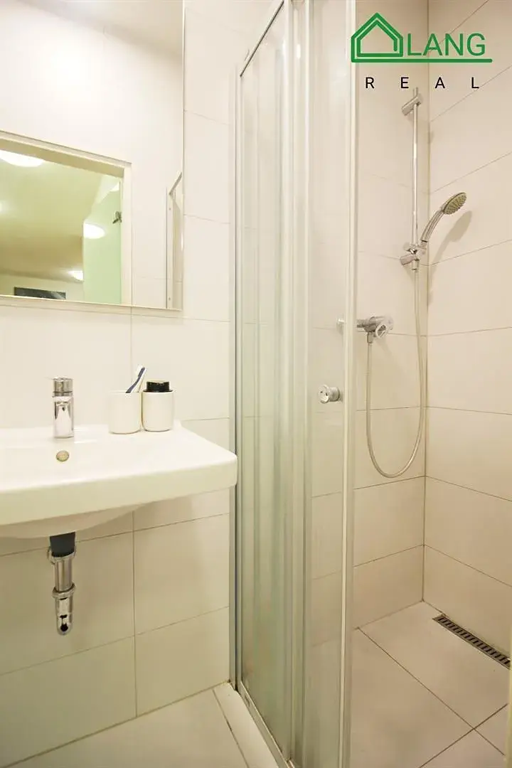 Koupelna je vybavená sprchovým koutem, umyvadlem, zrcadlem a toaletou.