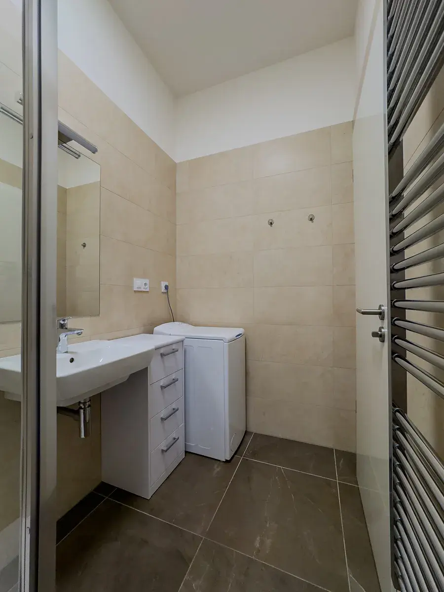 Dispozice bytu: vstupní chodba, obývací pokoj, ložnice, koupelna s umyvadlem, toaletou, sprchovým koutem a pračkou. V hlavní prostorné místnosti je kuchyňská linka s vestavěnými spotřebiči (lednice, mikrovlnná trouba, sklokeramická varná deska, myčka), gauč, jídelní stolek s dvěma židlemi, pracovní stůl. V ložnici je praktická šatní skříň a velká postel včetně matrace.