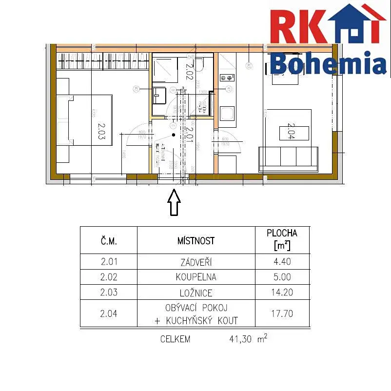 Byt se skládá ze zádveří (4,4 m2), koupelny s WC (5 m2), obývacího pokoje s kuchyňským koutem (17,7 m2), ložnice (14,2 m2) a terasy (cca 15 m2).