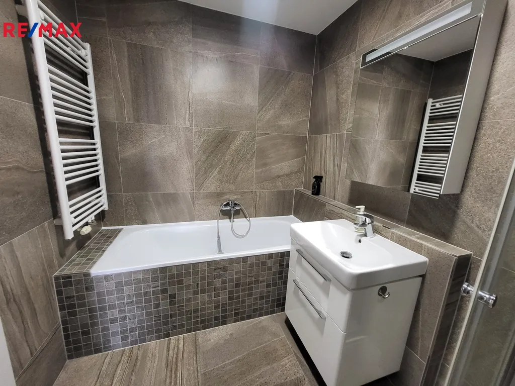 Koupelna nabízí kombinaci sprchového koutu a vany a disponuje dostatkem prostoru pro pračku i sušičku.