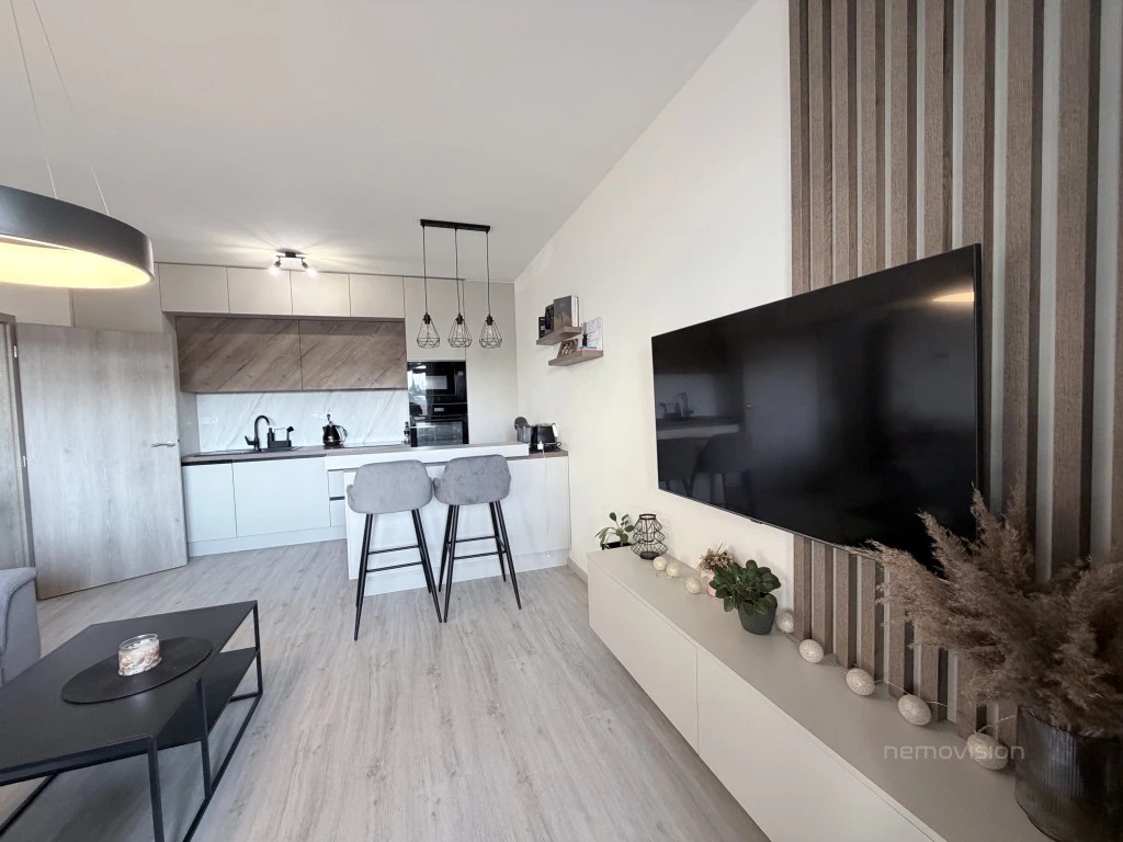 Byt je prakticky řešený, světlý a vybavený nábytkem na míru, který nabízí dostatek úložných prostor. Velkou předností je prostorná terasa, ideální pro relaxaci, posezení s přáteli nebo letní grilování.