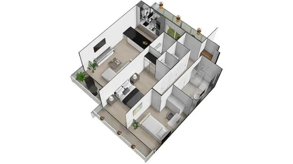Ve druhém křídle bytu je další komora o celkové výměře cca 2,5 m2 s přípravou na pračku a sušičku. Dále je tu samostatné WC o výměře cca 1,8 m2. Dvě ložnice jsou velmi prostorné, každá má velké okno s výstupem na propojený balkon o výměře cca 10,6 m2. Místnosti mají rozlohu cca 18,7 m2 a cca 17,2 m2.