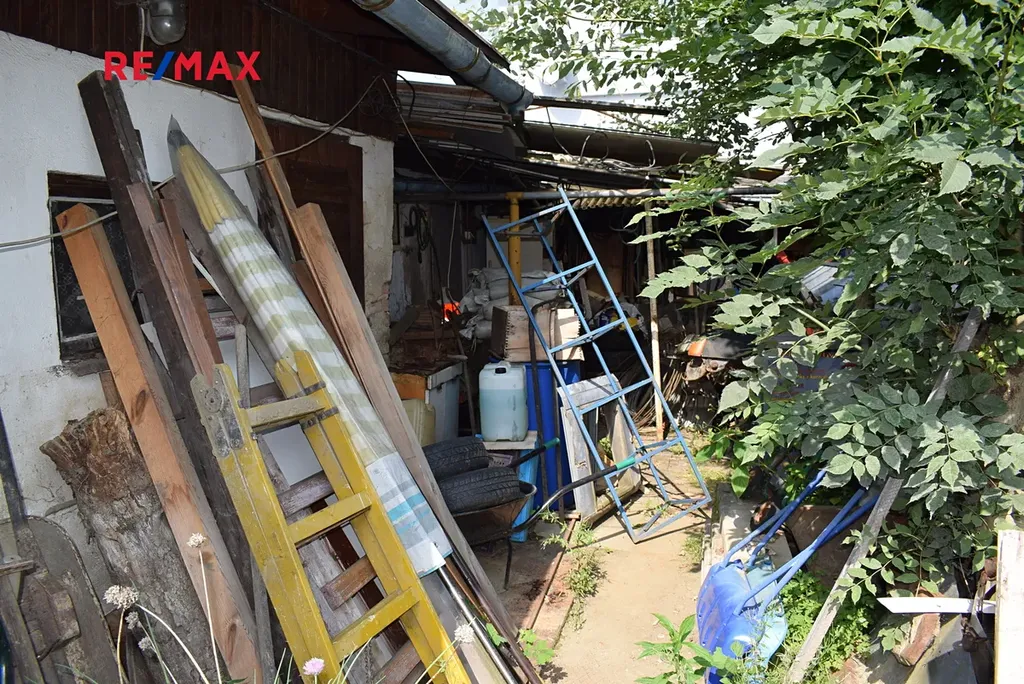 Na dvoře jsou dvě zděné garáže, dřevěné kůlny s dílnou, skleník a na konci zahrady je chatka s ubytováním....