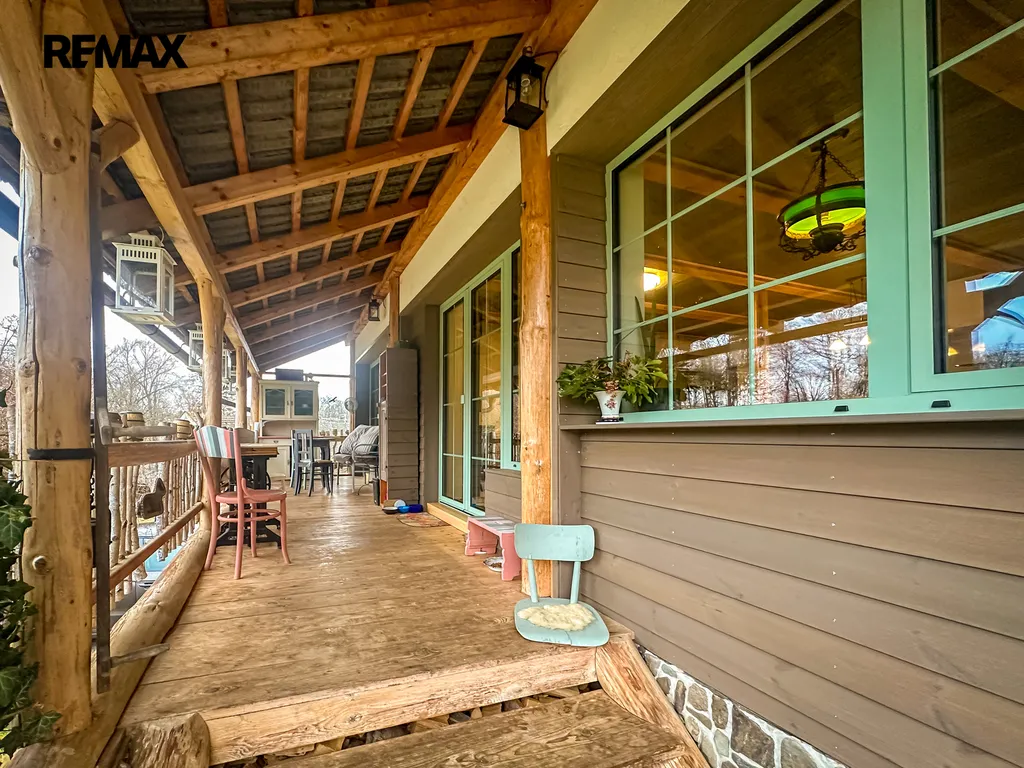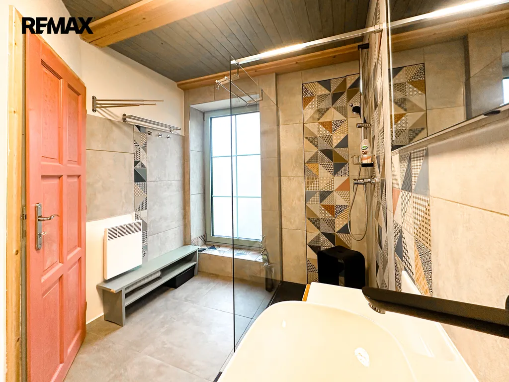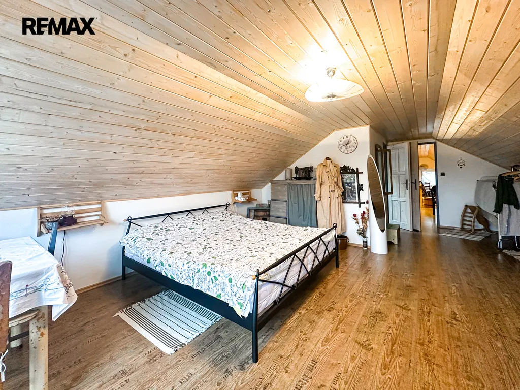 Do domu se vstupuje po několika schodech, kde se přímo dostaneme na velmi prostornou a zastřešenou terasu, kde můžete trávit spoustu času při kávě či odpočinku. Po vstupu do domu se napravo nachází velmi prostorná obytná místnost, které dominuje zcela funkční pec spolu i s kamny (nově postaveno). Prostor této místnosti se otevírá až ke krovu a po schodech se dostanete do prvního patra, kde se nachází další obytný prostor, kteří je otevřený k místnosti s pecí, dále se v patře nachází koupelna s vanou i záchodem, prostorná chodba a ložnice s velkoryse prosklenou stěnou.