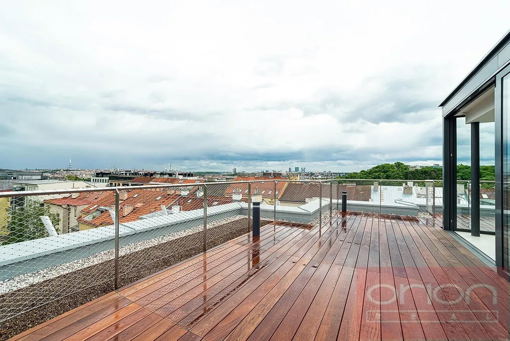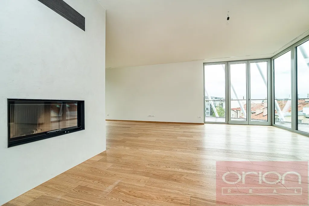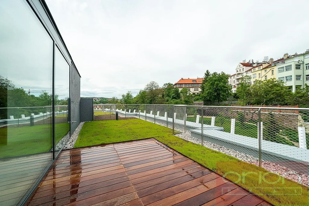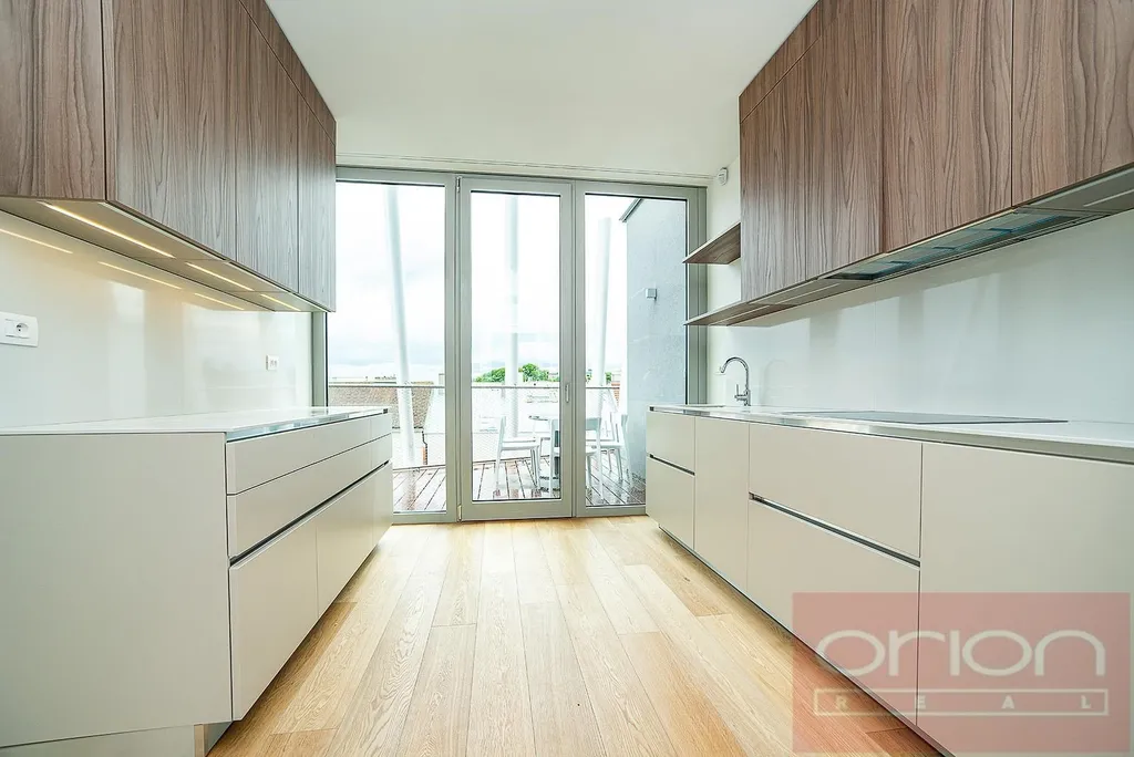 Nabízíme k pronájmu luxusní mezonetový byt 4+kk se třemi terasami a vlastní zahradou v 5. patře exkluzivního bytového komplexu Rezidence Ellipsis s recepcí, výtahem, podzemní garáží, wellness - bazén, sauna, a rozlehlou zahradou s parkovou úpravou ve vyhledávané lokalitě Praha 5 – Smíchov. Nezařízený byt s celkovou obytnou plochou 211,7 m2 nabízí v nižším patře halu, prostorný obývací pokoj s krbem spojený s jídelnou a plně vybavenou kuchyní a se vstupem na terasu s krásným výhledem, 3 ložnice se vstupem na terasu, 2 koupelny s vanou, sprchou, toaletou, bidetem (jedna koupelna je přístupná z ložnice), samostatnou toaletu, chodbu a prádelnu. V horním je patře je otevřená galerie (možná 4. ložnice) s privátním wellness se saunou, koupelna a vstup na střešní terasu se zahradou (31 m2). Součástí vybavení bytu jsou kvalitní dubové podlahy, velkoformátová dlažba, francouzská okna, bezpečnostní dveře, internet, klimatizace, pračka, sušička. K bytu náleží sklep. Nájem 5.400 EUR splatný v eurech + poplatky 150 Kč/m2 bytu + 21% DPH + extra členský poplatek 2.500 CZK/os/měsíc za využívání Wellness s vnitřním bazénem a saunou přímo v bytovém projektu. Možnost nájmu garážové stání za poplatek 230 EUR + 21% DPH/měsíc. Oblíbená lokalita Praha 5 - Smíchov s výborným dopravním spojením, v pěší vzdálenosti na stanici metra a tramvaje Anděl, do nákupního centra Nový Smíchov, do Německé a Francouzské školy. Autem blízký nájezd na Pražský okruh a dálnioční síť.