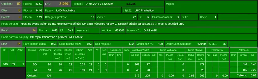 - p.č. 128 vedená jako lesní pozemek o celkové výměře 11 299 m2, vlastníme podíl 1/12 tedy 942 m2 (stáří lesa 111 let - zastoupení dřevin borovice, smrk, stáří lesa 57let - zastoupení dřevin bříza, smrk a stáří lesa 43let - zastoupení dřevin smrk)