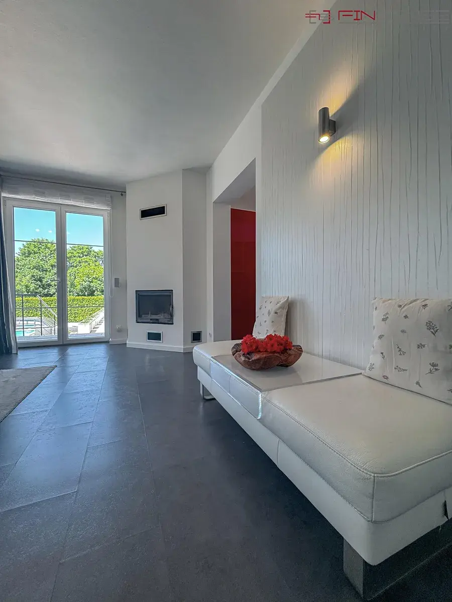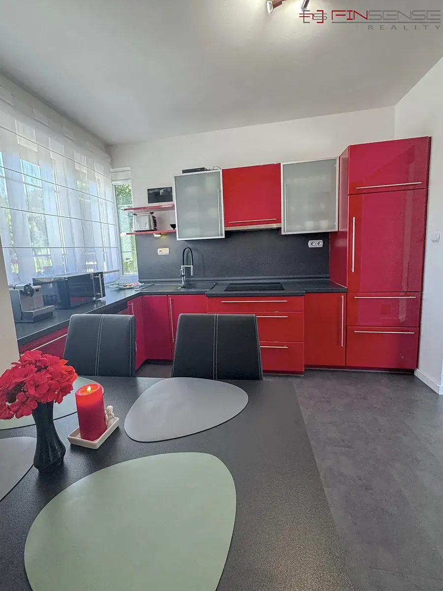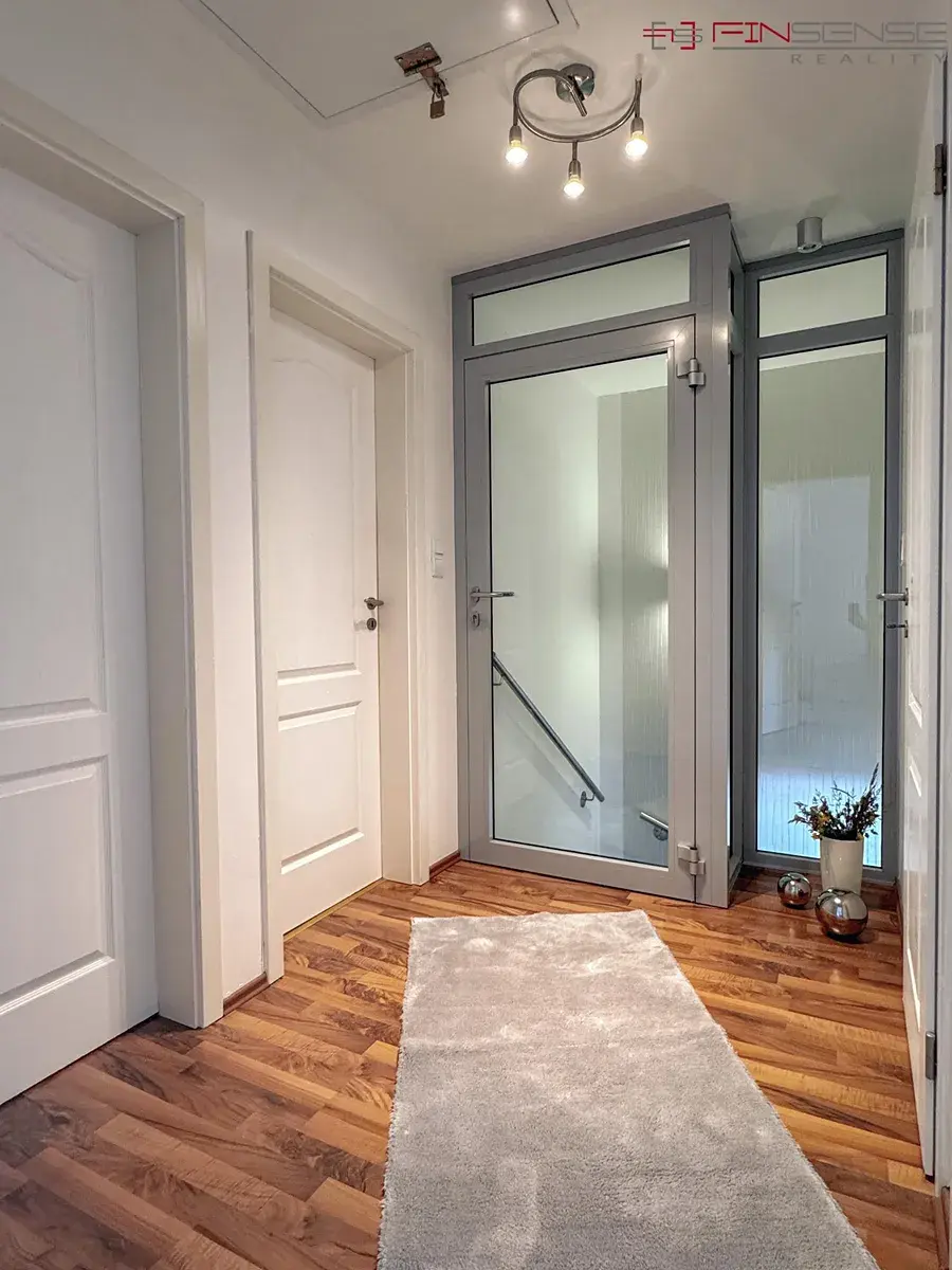 V přízemí domu se nachází vstupní chodba se zabudovanou skříní, skříňkou na klíče a ovládacím panelem zabezpečovacího systému. Dále koupelna se sprchovým koutem, WC, umyvadlem a zabudovaným zrcadlem. Kuchyň je plně vybavena a disponuje zabudovaným stolem se 4 židlemi. Na kuchyň navazuje obývací pokoj s koženou sedací soupravou s možností přespání, konferenčním stolkem, TV skříní, televizí a připojením k internetu. Interiér doplňují designové tapetové prvky a francouzské záclony. K domu náleží také balkony.