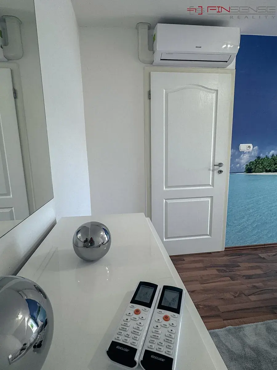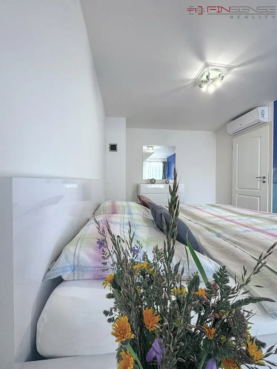V patře se nachází malá chodba se skleněnými dveřmi, které umožňují uzavření horního patra z důvodu bezpečnosti a snížení hluku. K dispozici jsou dvě ložnice, každá vybavená manželskou postelí o rozměru 180 × 200 cm, nočními stolky a klimatizací Sinclair. Dále je zde samostatná velká šatna se zabudovanými skříněmi a druhá koupelna s rohovou vanou, WC, zabudovanými skříněmi a pračkou.