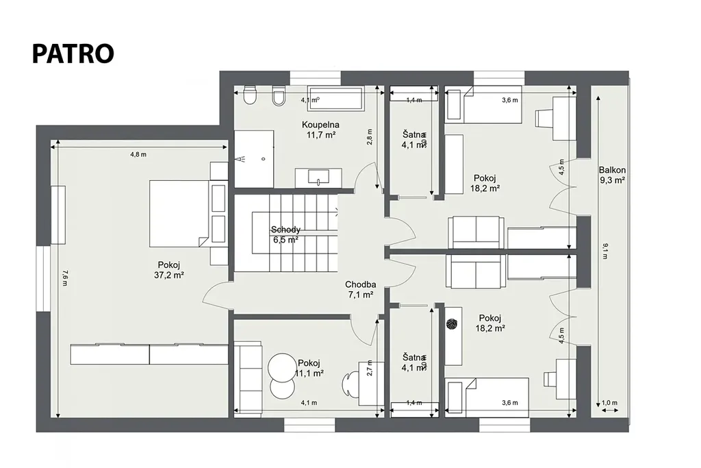 První patro domu nabízí čtyři prostorné ložnice, které zajistí dostatek soukromí a prostoru celé rodině. Hlavní ložnice je velkoryse řešena pro maximální pohodlí, zbývající tři pokoje lze využít jako dětské pokoje, pokoje pro hosty či další pracovny. V horním patře najdete také komfortní koupelnu s vanou a sprchovým koutem, která vám zajistí příjemný relax.