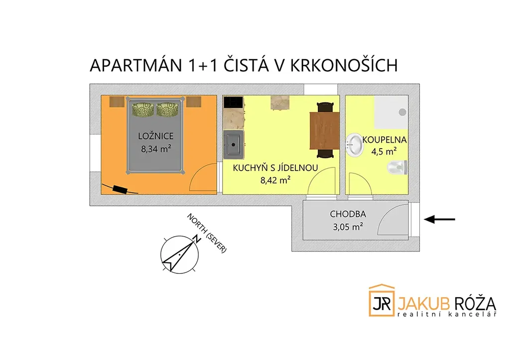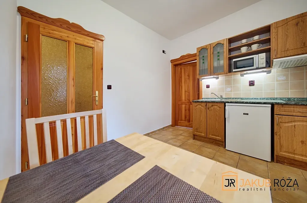 Apartmán o dispozici 1+1 a velikosti užitné plochy 24,3 m2 je umístěný v přízemí dvoupodlažního domu s 10 apartmány. Apartmán je kompletně vybaven nábytkem a je nabízen včetně tohoto vybavení.