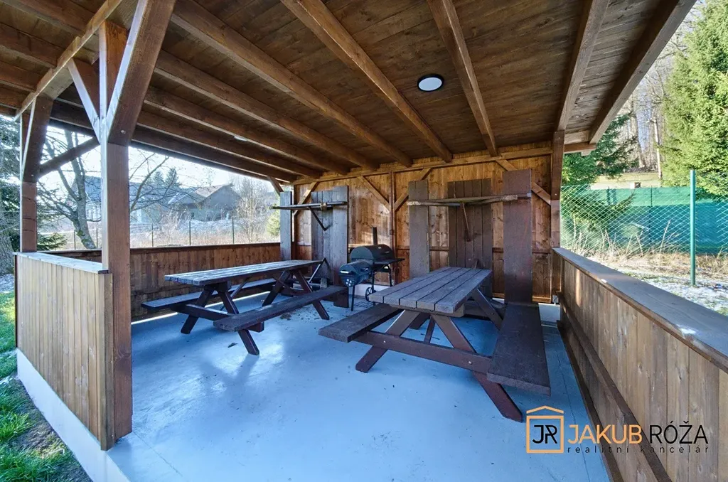 K objektu náleží společná rovinatá slunná zahrada o výměře 920 m2, vybavená altánem s posezením a grilem, dětským hřištěm a společným parkovištěm.