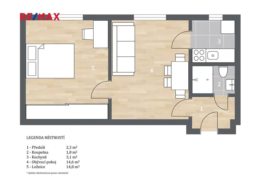 Dispozice bytu nabízí obývací pokoj (14,8 m2 ), ložnici (14,6 m2 ) s větší vestavěnou skříní, samostatnou kuchyní s menším oknem, koupelnou která je vybavená sprchovým koutem a toaletou. K bytu dále náleží větší sklep o velikosti 5,3 m2.