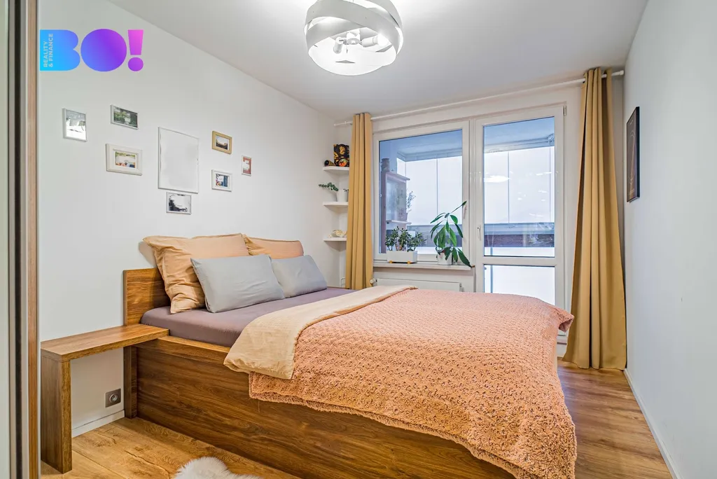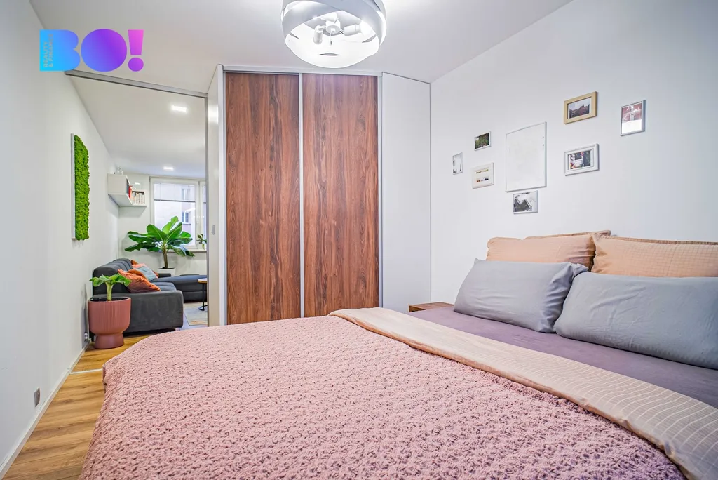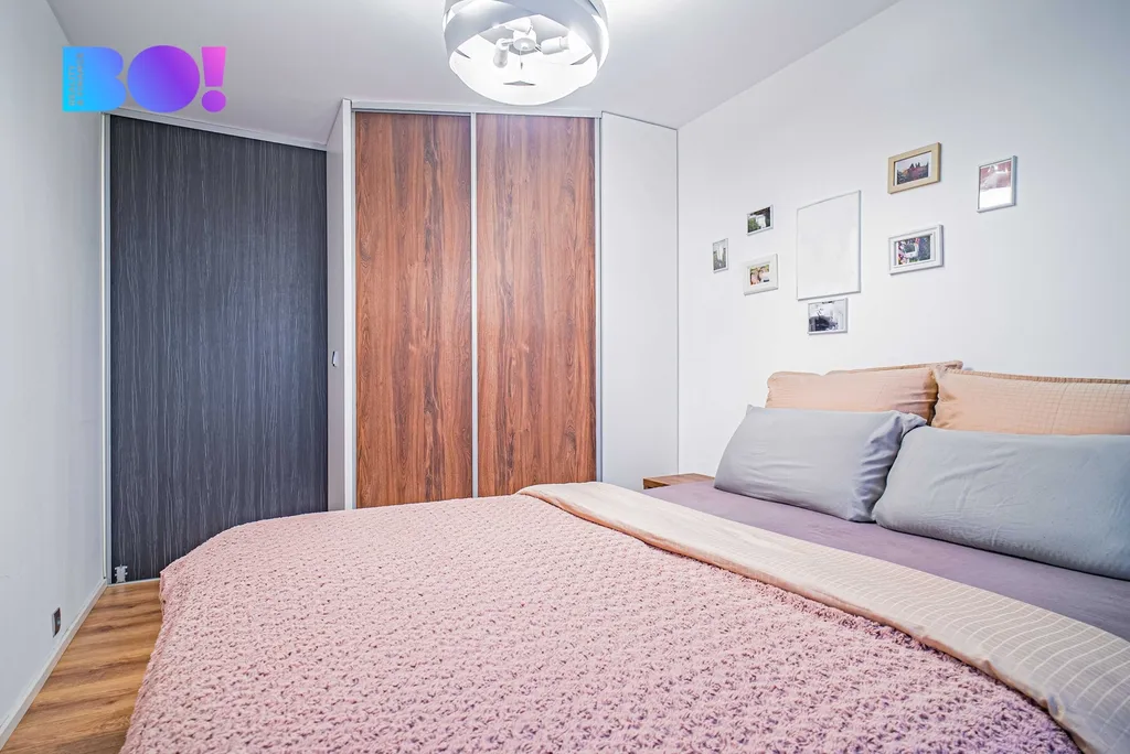 Z obývacího pokoje se přes posuvné dveře dostanete do ložnice, kde se nachází šatní skříň vyrobená na míru, do které lze doslova vstoupit. Na ložnici navazuje výrazně zvětšená zasklená lodžie (2,5 × 1,6 m), na kterou se pohodlně vejde posezení nebo ji můžete využít třeba k pěstování zeleniny. Bonus navíc? Přímý výhled na Javorový vrch.