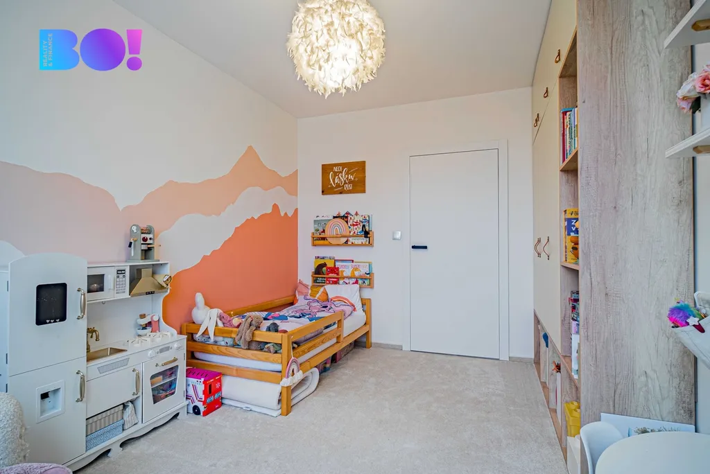 Dětský pokoj působí velmi útulně, nabízí velkou skříň a stylovou výmalbu.