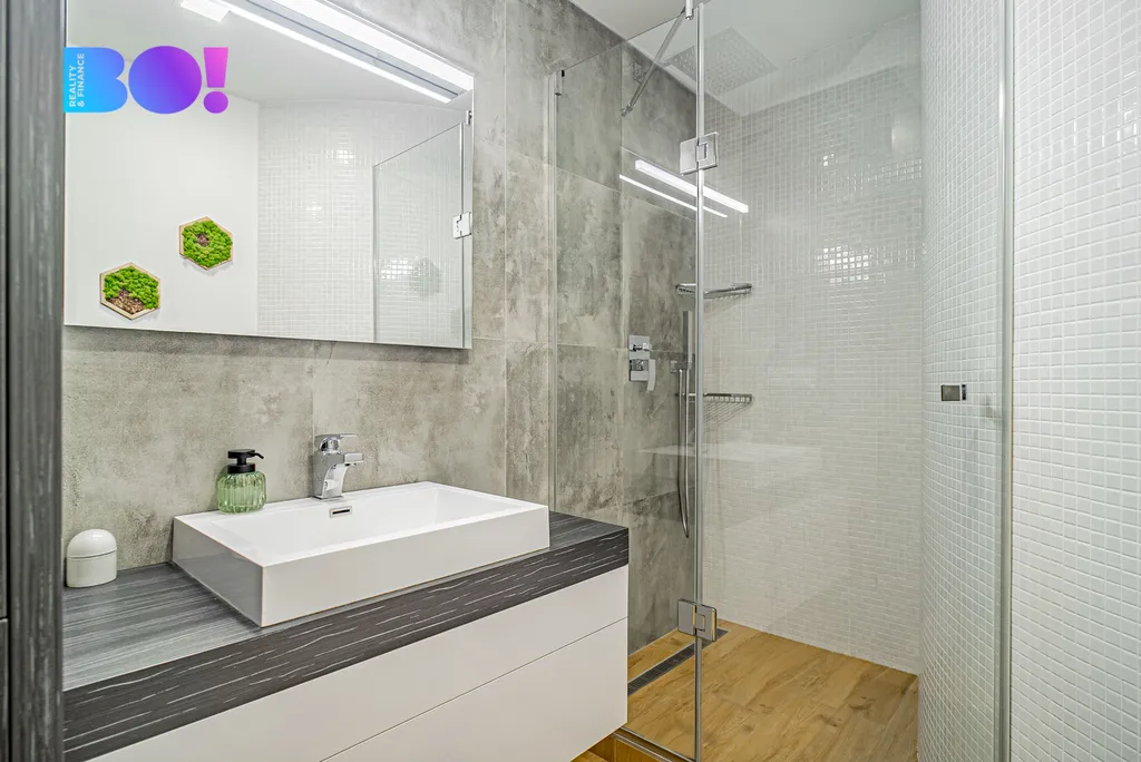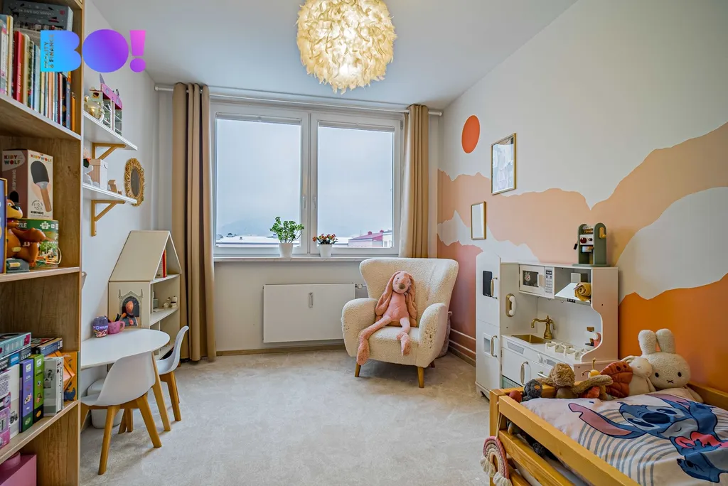 Ve většině bytu je jednotná podlaha bez prahů, koberec se nachází pouze v dětském pokoji. Díky změně dispozice vznikla velmi prostorná koupelna s vestavnou skříní, do které se pohodlně vejde pračka i další věci. Samozřejmostí je dostatek úložného prostoru a velká sprcha, kde si po náročném dni skutečně odpočinete.