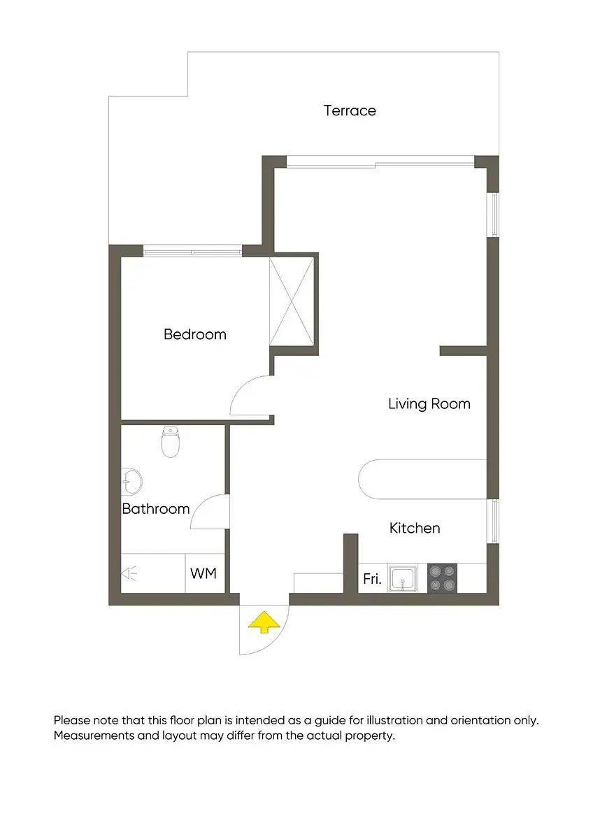 Interiér má otevřenou a vzdušnou dispozici s propojeným obývacím pokojem a kuchyní. Velké posuvné dveře přirozeně propojují vnitřní prostor s terasou a umožňují plynulé přechody mezi interiérem a exteriérem. Apartmán disponuje jednou světlou ložnicí s vestavěnými skříněmi a jednou moderní koupelnou se sprchovým koutem a pračkou.