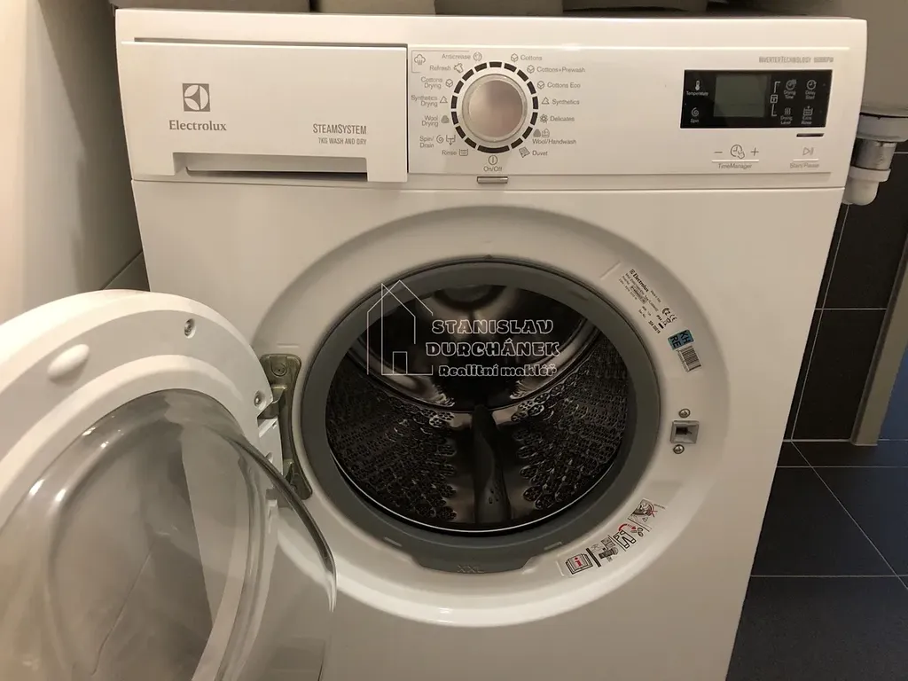 Společné části bytu jsou koupelna s vanou, 2 umyvadly, pračkou se sušičkou a dále samostatné WC s umyvadlem a vstupní chodba se skříní.
