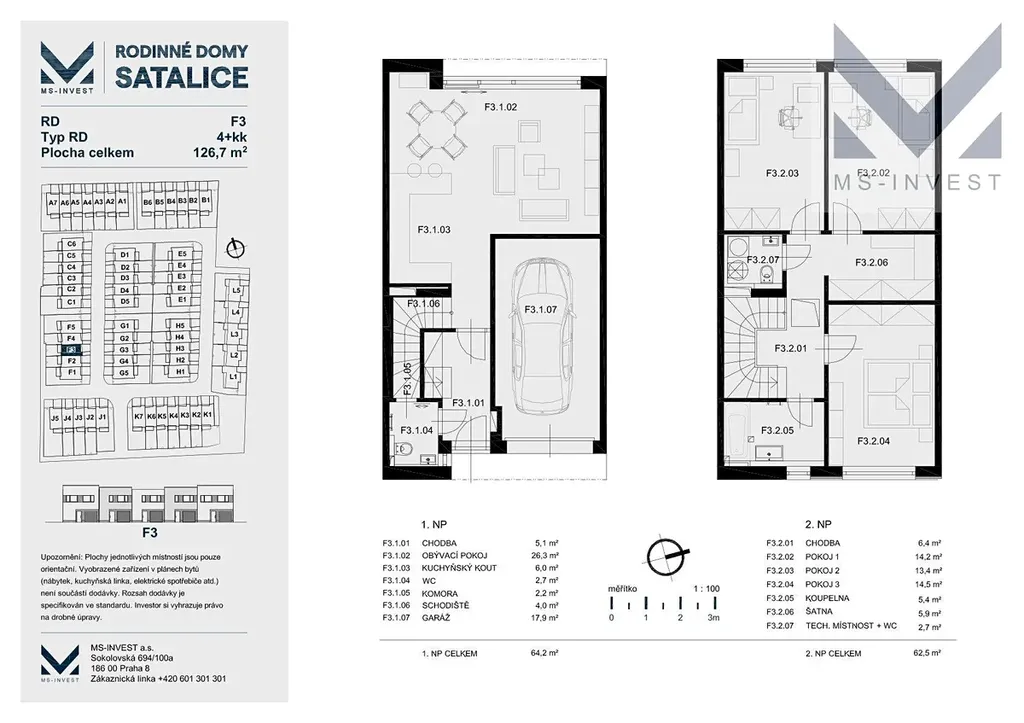 Nabízený dům F-3 o velikosti 4+kk a celkové podlahové ploše 127 m2 s pozemkem o ploše 168 m2 disponuje v 1. NP vlastní garáží, šatnou, komorou, toaletou, prostorným obývací pokojem s kuchyňským koutem o ploše 30 m2 a navazující terasou propojující dům se zahradou. Zahrada je orientována na západ, do zahrad stávajících rodinných domů. Ve 2. NP se nachází hlavní ložnice o ploše 15 m2, dále 2 další ložnice, koupelna s vanou a samostatné WC spojené s technickou místností. Pozemek tohoto domu má velikost 168 m2.