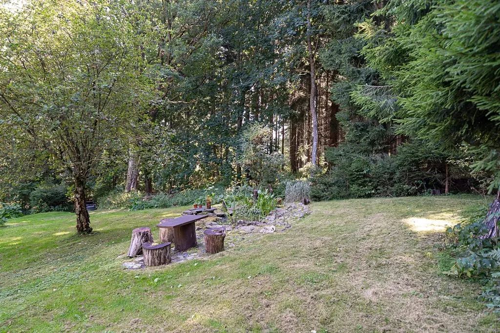 Pozemek kolem chaty je udržovaný s okrasnými a ovocnými keři, jezírkem a ohništěm.