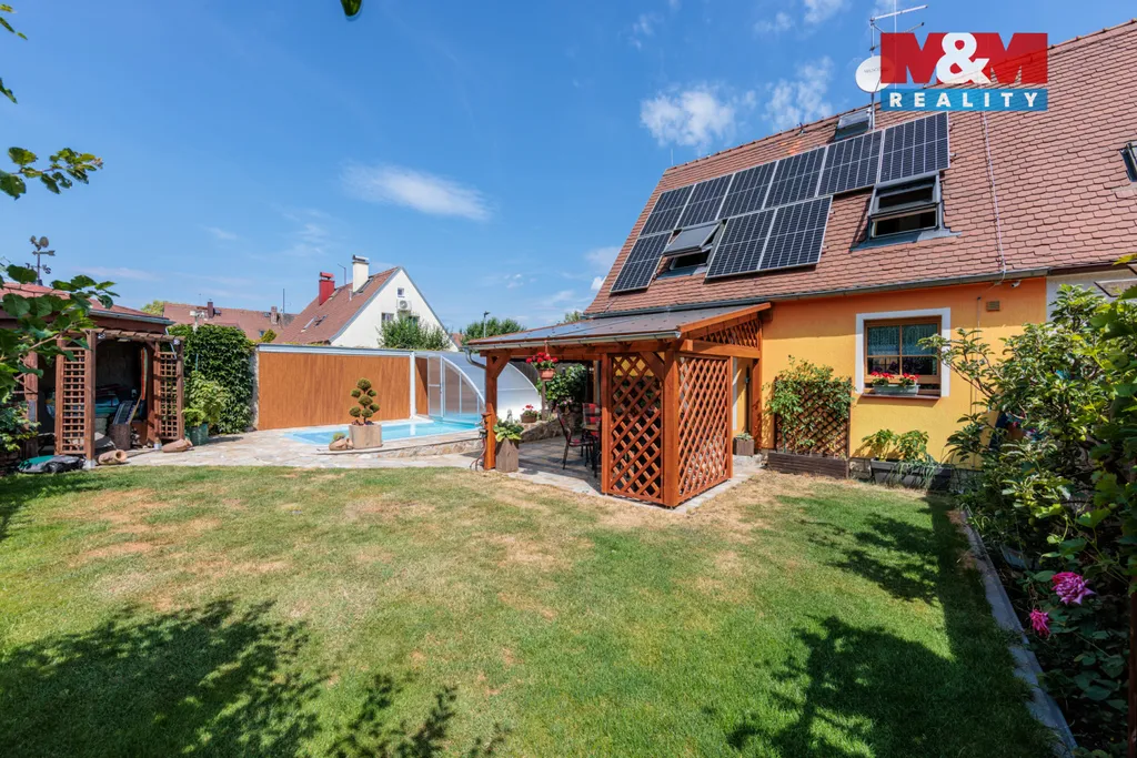 Soukromá zahrada o velikosti 267 m² nabízí krytý, vyhřívaný bazén se slanou vodou, pergolu a grilovací kout. Celý pozemek je oplocen 2,5 m vysokou zdí, doplněn elektrickou bránou a parkováním až pro čtyři vozy.