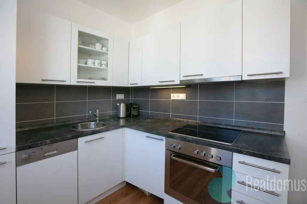 Kuchyně je světlá, praktická a plně vybavená moderními spotřebiči.