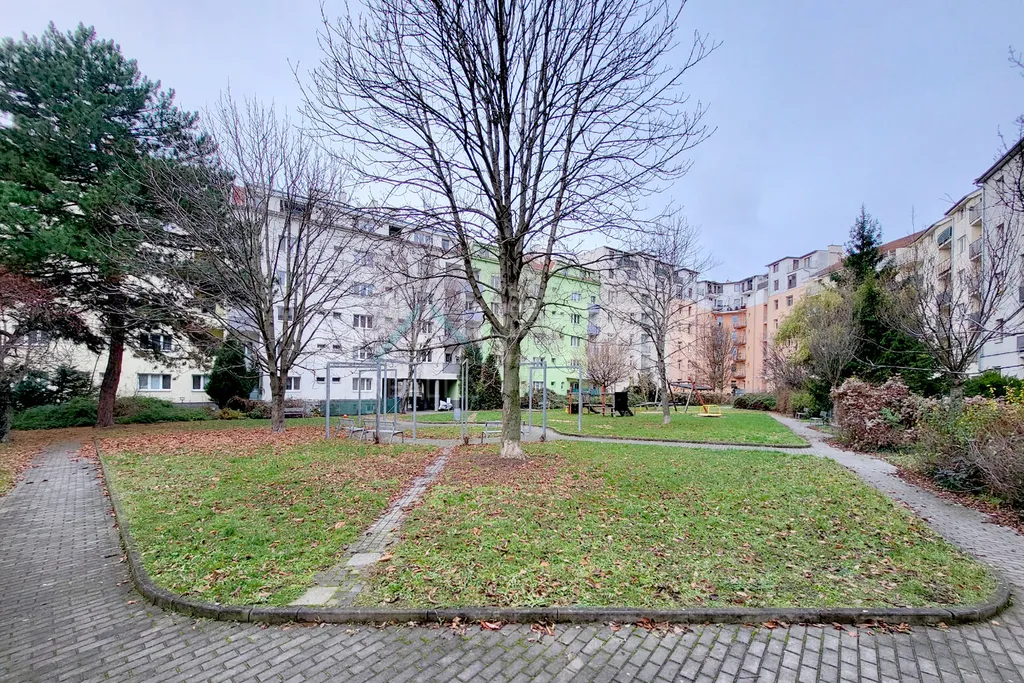 Lodžie orientovaná do klidného vnitrobloku je pak ideálním místem pro kávu, snídani nebo večerní posezení. Vnitroblok samotný vás možná překvapí – je tu dětské hřiště, zeleň, lavičky… a celkově atmosféra malého komunitního světa schovaného mezi domy.