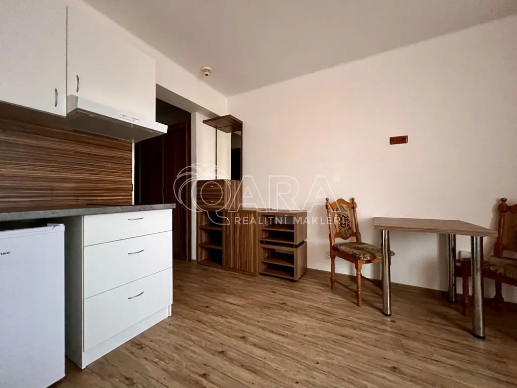 Jedná se o kompletně zrekonstruovanou jednotku, která se nachází ve 2.NP cihlového domu s výtahem. Sestává z chodby, která je vybavena předsíňovou skříní s botníkem a šatní skříní. Z chodby se dostaneme do obytné části, která je zařízena menší kuchyňskou linkou s lednicí s mrazákem, pečící mikrovlnnou troubou s grilem, digestoří a dvouplotýnkovou varnou deskou. Dále je jednotka vybavena jídelním stolem s židlemi, komodami, rozkládací postelí s matracemi a menší televizí. Koupelna je přístupná z chodby a je vybavena sprchovým koutem, umyvadlem, skříňkou pod umyvadlem a WC.