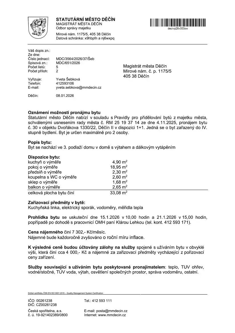 Statutární město Děčín nabízí k pronájmu byt v dispozici 1+1 v objektu Dvořákova 1330/22, Děčín II ve 3. nadzemním podlaží s výtahem o výměře 33,08 m2 ve vlastnictví statutárního města Děčín, v dosahu veškeré infrastruktury. Byt je dálkově vytápěn.