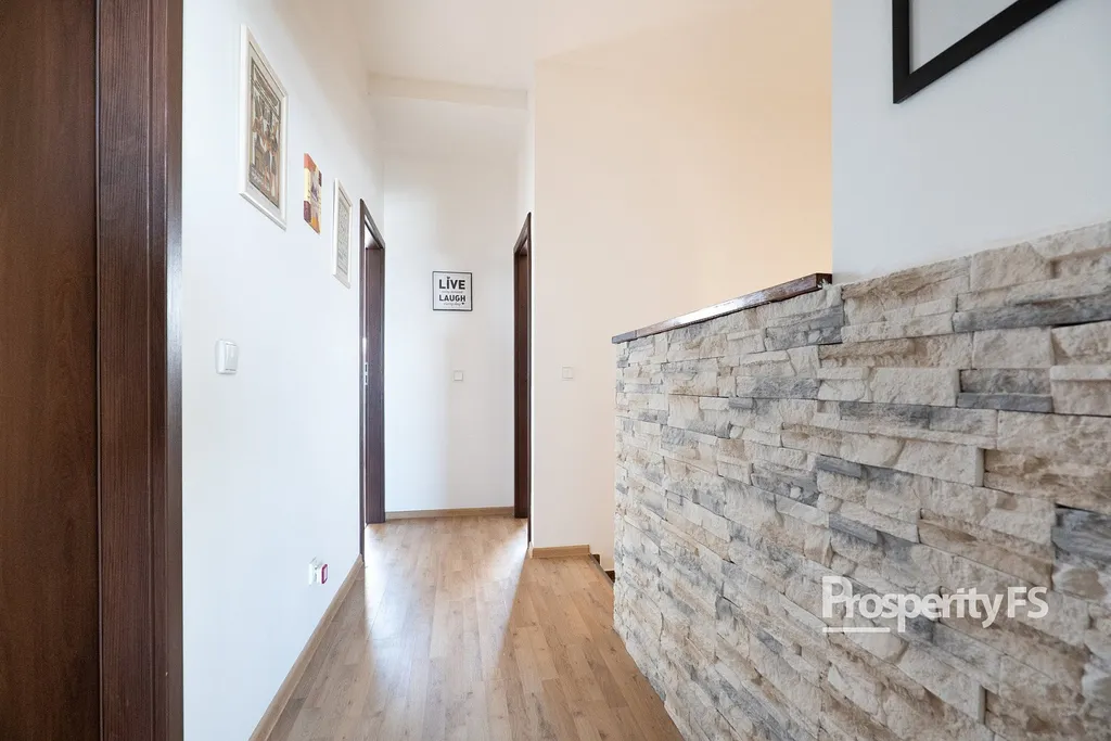 V horním patře se nalezneme 3 neprůchozí místnosti a prostornou koupelnu s podlahovým vytápěním, vanou, WC, 2 umyvadly a praktickým úložným prostorem.