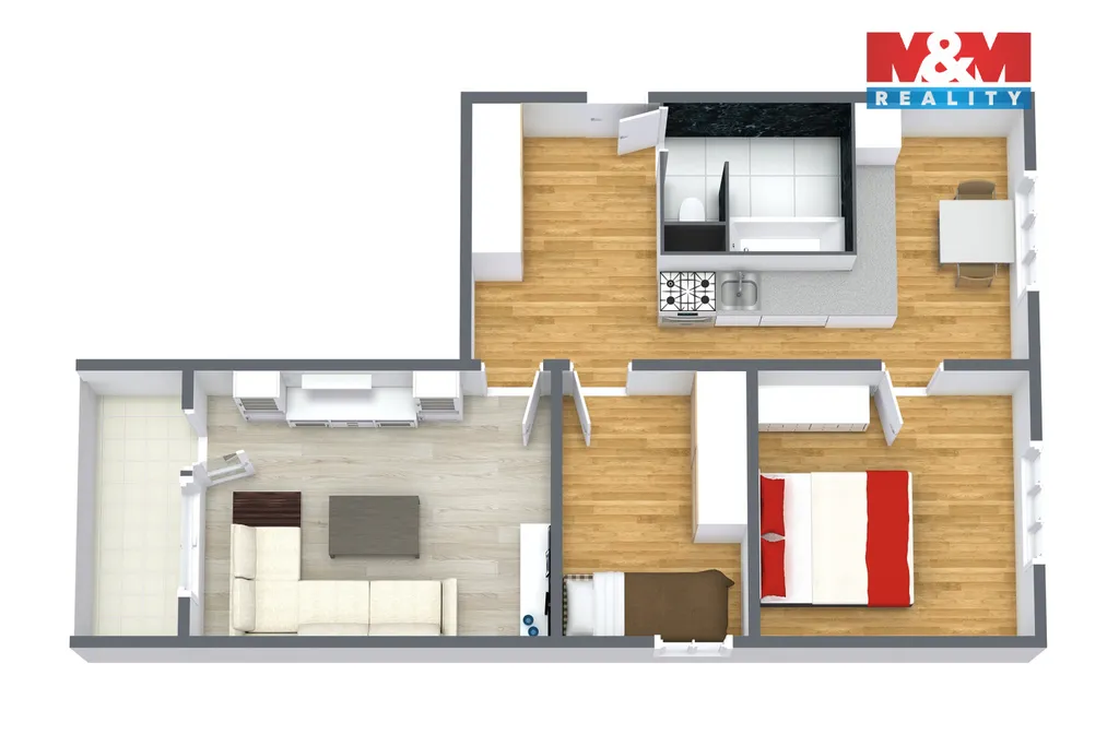 Dispozičně je byt velmi dobře řešený – dominuje mu prostorný obývací pokoj se vstupem na balkon, který poskytuje příjemné místo k odpočinku. K dispozici jsou dále dvě neprůchozí ložnice, samostatná kuchyně, koupelna a oddělené WC. Díky neprůchozím pokojům je byt vhodný jak pro rodinné bydlení, tak i jako investiční příležitost.