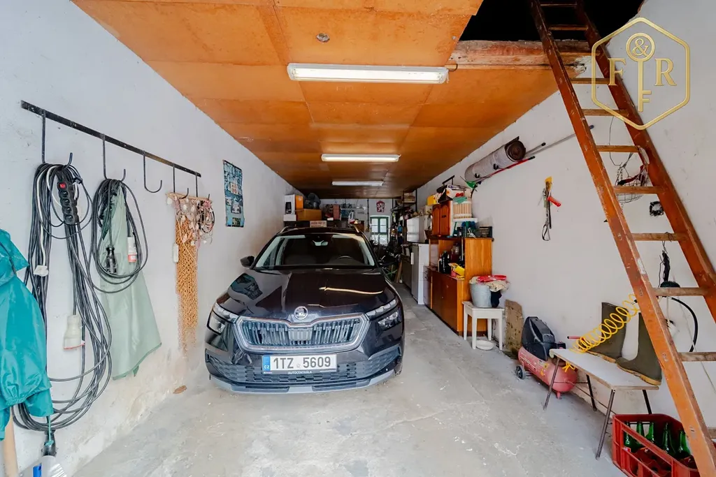 Vedle hospodářské budovy je také garáž s dílnou a prostor pro uskladnění zahradního vybavení.