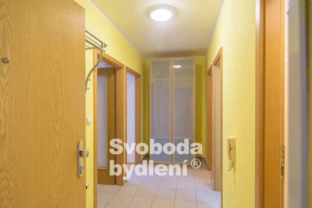 Vstupní dveře bytu vedou do předsíně, na jejíž pravé straně nalezneme koupelnu (cca 3,6m2), samostatnou toaletu (cca 1,3m2) a první komoru (cca 3m2). Druhá komora (cca 1,7m2) je umístěna vlevo, dále pak pokračujeme do kuchyně, jenž je v místě pro jídelní stůl otevřena do obývacího pokoje (cca 21m2), který má současně vstup také z předsíně. Z obývacího pokoje pokračujeme dále do ložnice (cca 10m2).