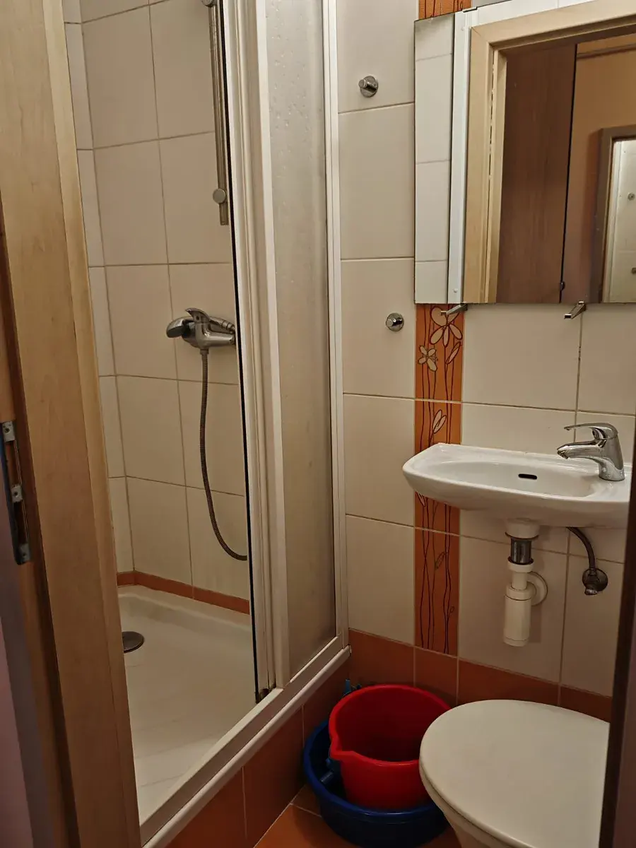 Příjemně velký pokoj (21m2) s kuchyňskou linkou (plynová varná deska, dřez, připojení pro pračku), s jídelním stolem a židlemi, předsíň s šatními skříněmi, koupelna (sprchový kout, umyvadlo, WC).