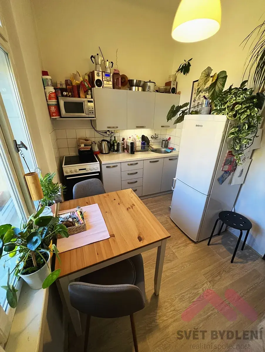Dispozice bytu zahrnuje samostatný pokoj, prostornou kuchyň, předsíň a koupelnu s WC. Byt je vhodný pro jednu osobu nebo pár (CZ).