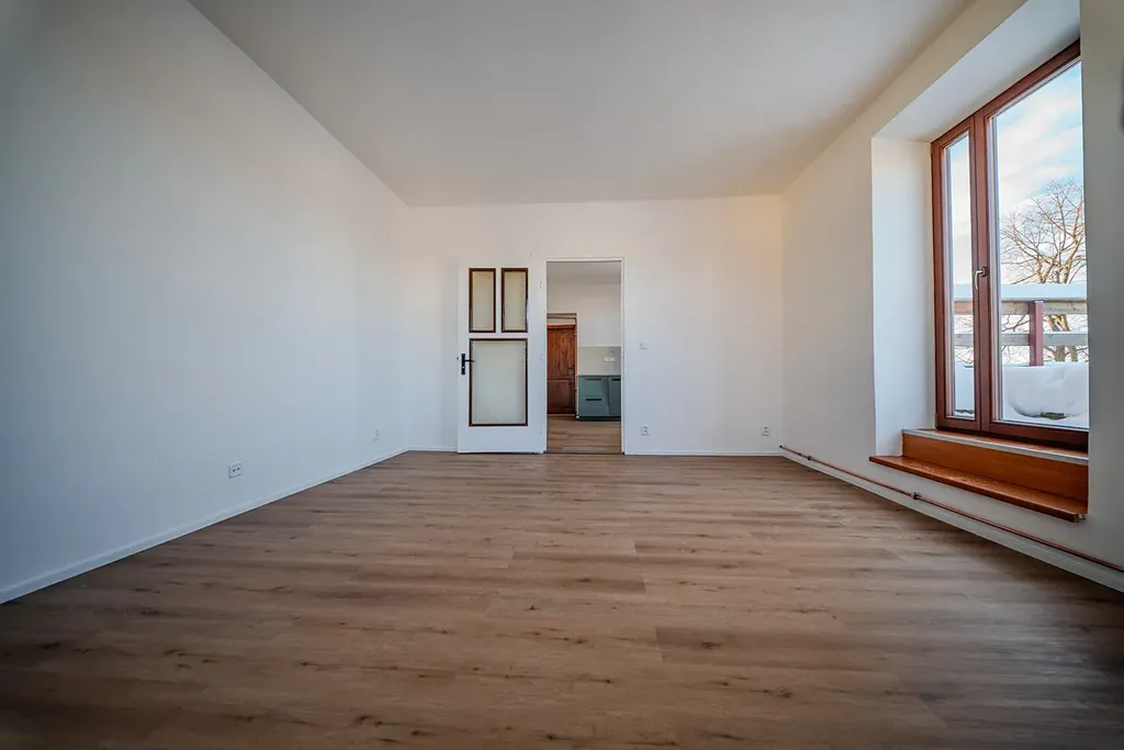 Interiér o celkové ploše 38,7 m² působí vzdušně a harmonicky díky promyšlené dispozici a dostatku denního světla. Byt tvoří hlavní obytná místnost a vstupní pokoj s nově instalovanou kuchyní v elegantním matném šedozeleném odstínu, doplněné černými akcenty. Celý prostor sjednocuje vinylová podlaha v dekoru přírodního dřeva, která interiéru dodává nadčasovost a příjemnou atmosféru.