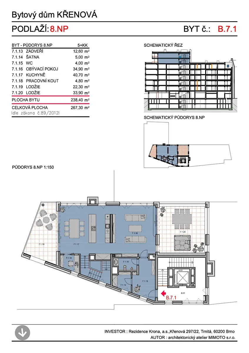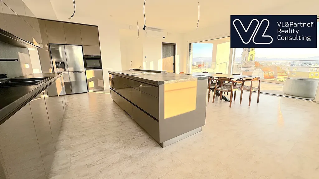 Nabízíme k prodeji výjimečný mezonetový byt o dispozici 5+kk a užitné ploše 267 m², situovaný ve dvou nejvyšších podlažích (7. a 8. NP) novostavby bytového domu na ulici Křenová.