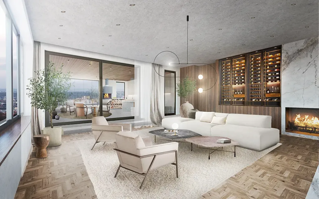 Dominantou bytu je 8. podlaží, které nabízí rozsáhlý obývací prostor s kuchyní, vyznačující se vzdušným charakterem a dostatkem přirozeného světla. Tento prostor vytváří ideální prostředí pro rodinný život i reprezentativní společenská setkání. Propojení s navazující zimní zahradou o celkové výměře 34 m² poskytuje jedinečné výhledy na město a zároveň klidné zázemí pro relaxaci uprostřed rušného centra.