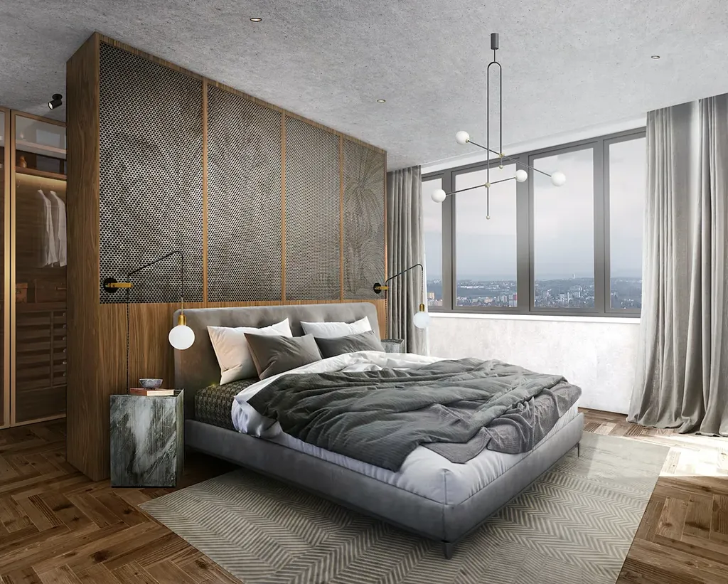 Dispozice bytu je navržena s důrazem na funkčnost, soukromí a komfort všech členů domácnosti. Spodní podlaží tvoří klidová zóna se třemi ložnicemi, pracovnou a dvěma koupelnami, zatímco horní patro slouží jako otevřený společenský prostor s přímým vstupem na lodžii a do zimní zahrady. Všechny místnosti jsou koncipovány tak, aby nabízely dostatek úložného prostoru, světla a soukromí.