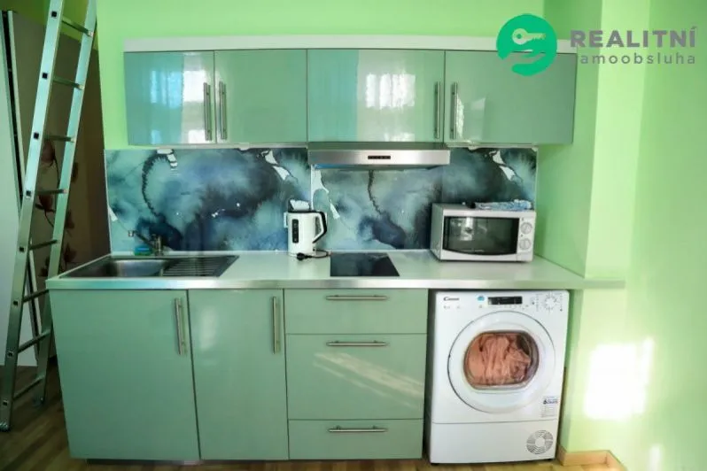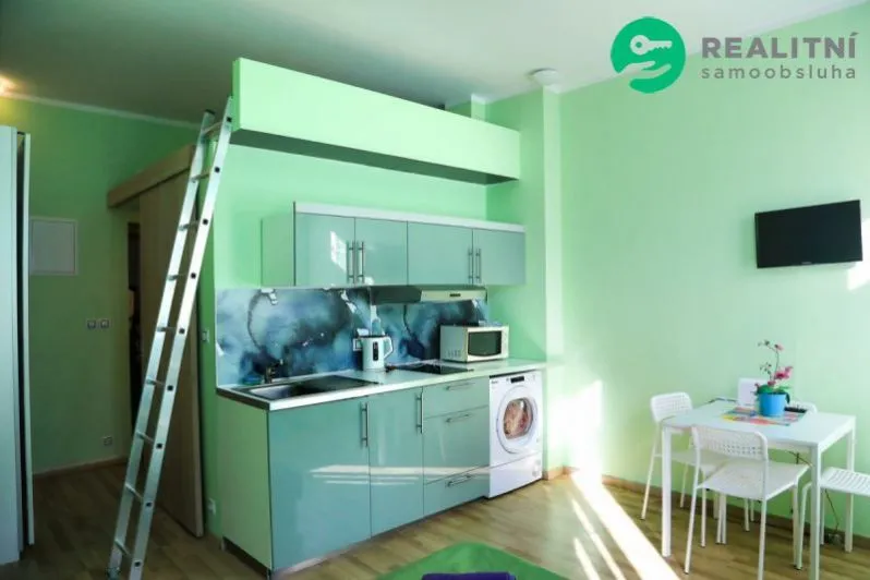 Byt o celkové ploše 26 m se nachází ve 3. nadzemním podlaží cihlového domu s výtahem a náleží k němu sklepní kóje. Interiér je prakticky a moderně řešen: kuchyňský kout, koupelna, vestavěné patro na spaní, podlahové vytápění. Byt je dále vybaven pračkou a sušičkou.