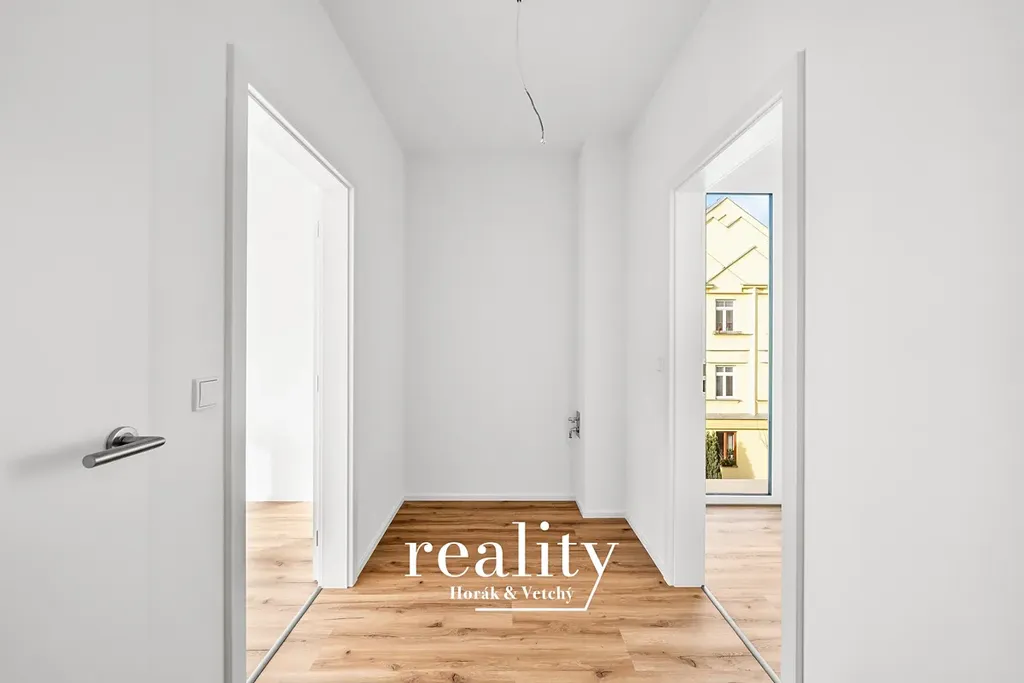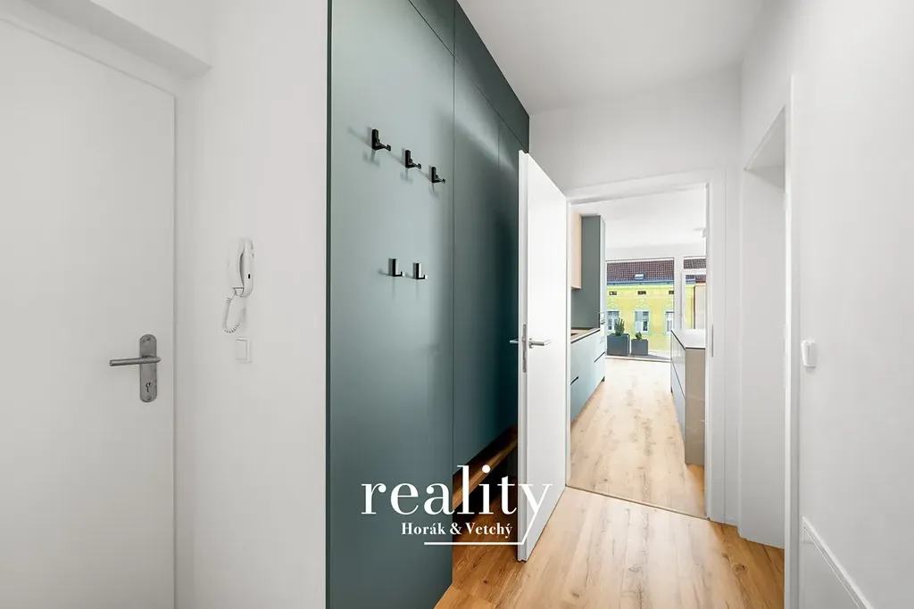 Vstupní část bytu je vybavena úložným prostorem, vyrobeným na zakázku, který lze vidět na fotkách. Z předsíně je vstup do samostatného WC a dále do koupelny, která je vybavena vanou i sprchovým koutem. Z chodby plynule přecházíme do prostoru pro kuchyň a obývací pokoj (31,9 m2).